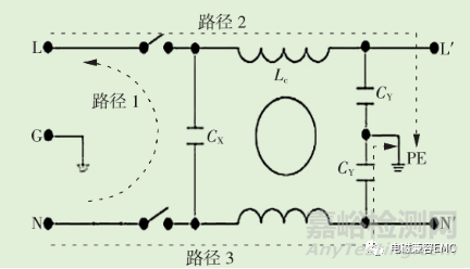 GB 9706.1-2007 標準 15 b)對剩余電壓規(guī)定:用插頭與供電網連接的設備,應設計成在拔斷插頭后1 s 時,各電源插腳之間以及每一電源插腳與外殼之間的電壓不超過 60 V。因此,在測試剩余電壓時 CX電容充滿電能,在插頭拔斷后 1 s,CX電容能量釋放到L 線與 N 線之間,其能量泄放路徑為下圖6路徑 1。