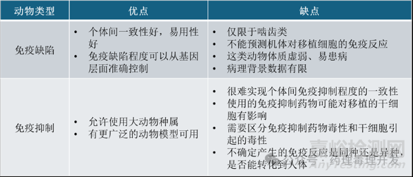 相比于健康動(dòng)物,免疫缺陷動(dòng)物潛在可減少免疫排斥,即免疫耐受性表現(xiàn)更好。免疫缺陷動(dòng)物可以是先天缺陷,也可以給予免疫健全動(dòng)物免疫抑制藥物實(shí)現(xiàn)。免疫缺陷和免疫抑制動(dòng)物模型也是各有優(yōu)劣,如下表所示。