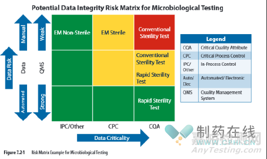 結(jié)合檢驗(yàn)的關(guān)鍵性、質(zhì)量體系的成熟度和降低風(fēng)險(xiǎn)的技術(shù),可以建立風(fēng)險(xiǎn)矩陣。可以根據(jù)測(cè)試是否為關(guān)鍵質(zhì)量屬性(CQA)(如無菌檢查)來確定數(shù)據(jù)的關(guān)鍵性,關(guān)鍵工藝控制(CPC),如環(huán)境監(jiān)測(cè)試驗(yàn);或者過程控制/其他測(cè)試,如非無菌產(chǎn)品的環(huán)境監(jiān)測(cè)。下圖顯示了應(yīng)用于數(shù)據(jù)完整性的風(fēng)險(xiǎn)矩陣。在本例中,矩陣用于確定在批準(zhǔn)測(cè)試結(jié)果之前,哪些微生物測(cè)試需要第二人復(fù)核。