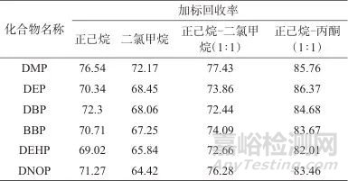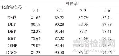 使用哪種溶劑比較合適,與目標(biāo)物分子的極性息息相關(guān)。對于鄰苯二甲酸酯類來說,兩條側(cè)鏈越長,分子極性越小,越易溶于極性小的溶劑,反之亦然。為了能覆蓋全部的目標(biāo)物,選擇混合溶劑較為合適。而丙酮的極性比較大,甚至能和水任意互溶,添加丙酮的目的就是針對一些水分較大的樣品,它能將樣品的水膜破壞,使目標(biāo)物順利溶解于溶劑中。為此,選取了水分含量達(dá)30%的有機(jī)肥料進(jìn)行了加標(biāo)回收試驗(yàn),分別使用正己烷、二氯甲烷和丙酮進(jìn)行提取,考察提取溶劑對加標(biāo)回收率的影響,結(jié)果見表1。由表1數(shù)據(jù)可知,正己烷-丙酮(體積比為1∶1)混合溶劑為最佳選擇。