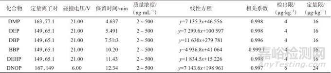 Tab. 4 Linear range,linear equation,detection limit,and quantification limit of 6 PAEs