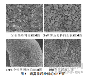 對(duì)含納米硅、CNT 和石墨的漿料進(jìn)行噴霧,對(duì)噴霧前后的粉料進(jìn)行 SEM 考察,結(jié)果見圖 2。噴霧前加入的石墨基體為典型的片狀結(jié)構(gòu),尺寸為5~20 μm [圖 2(a)]。石墨的粒徑分布測試顯示 D50 為 15μm。噴霧后獲得的粉料呈類球形的形貌[圖 2(b)],可見噴霧后石墨被包覆層包覆。粒徑測試噴霧后粉料的 D50為 26.2 μm。對(duì)二次顆粒的形貌特征進(jìn)行 SEM 觀察,呈現(xiàn)由納米材料堆積的疏松多孔結(jié)構(gòu)的特征[圖 2(c)],多孔結(jié)構(gòu)為硅納米片和 CNT 相互交織而成[圖 2(d)],測試比表面積(BET)高達(dá) 53.3 m2/g。因此,經(jīng)噴霧后,硅納米片和CNT自組裝形成多孔結(jié)構(gòu)。