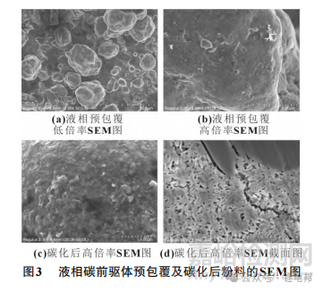 對(duì)多孔層進(jìn)行液相碳包覆處理,加入碳包覆前驅(qū) 體瀝青和碳化后,進(jìn)行 SEM 考察,結(jié)果見圖 3。碳預(yù)包覆后,二次顆粒表面變得光滑,明顯有一層包覆層,并且包覆完整,如圖 3(a)和(b)所示。碳化后,表面包 覆層均保持良好的包覆狀態(tài)[圖 3(c)]。此外,考察截面 SEM 圖,含條形狀納米顆粒[圖 3(d)],對(duì)應(yīng)納米片的形貌特征,進(jìn)一步驗(yàn)證了球磨后形成硅納米片。并且,圖 3(d)顯示部分納米片之間有填充物,這主要是由于采用液相包覆的方法,瀝青溶液會(huì)滲透到材料內(nèi)部,使內(nèi)部的硅納米片表面獲得碳包覆保護(hù)層。因此,采用液相包覆,除了獲得二次顆粒包覆效果外,還可以獲得一次顆粒包覆的雙重碳包覆的效果。對(duì)碳化粉體進(jìn)行BET測試,測試結(jié)果為22.3 m2/g。