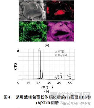 對(duì)碳化后的粉體進(jìn)行截面能譜分析(EDS),結(jié)果見圖 4(a),微米級(jí)的內(nèi)核為 C 成分,對(duì)應(yīng)石墨基體,外層的包覆層含硅和氧。為進(jìn)一步考察硅的結(jié)構(gòu),進(jìn)行 X 射線衍射(XRD)測試,結(jié)果見圖 4(b),材料主要為石墨和單晶硅的組成,無明顯氧化硅特征,說明能 譜測試的氧成分主要來自于硅表面的自然氧化。該硅碳復(fù)合材料記為S1。