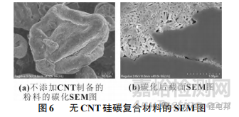 不添加 CNT 的硅碳復(fù)合材料,其碳化粉料的形貌見圖 6。液相包覆和碳化后,圖 6(a)中二次顆粒表 面可明顯看到有一層包覆層。碳化后材料的截面 SEM 見圖 6(b),硅納米片的堆積,本身具有多孔特征,測試 BET 為 16.6 m2/g。但相比有 CNT 的情況[如圖 3(d)所示,其碳化粉體 BET 測試為 22.3 m2/g],其內(nèi)部納米硅的堆積緊密度更高,說明添加 CNT 可促進(jìn)多孔結(jié)構(gòu)的形成。另外,該材料沒有由 CNT 構(gòu)筑的立體導(dǎo)電網(wǎng)絡(luò)。該硅碳復(fù)合材料記為S2。