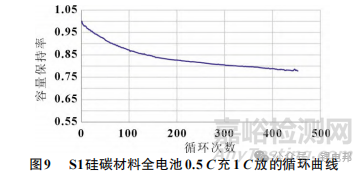 對(duì) S1 硅碳材料進(jìn)行小軟包全電池制作,考察倍率性能和循環(huán)性能。放電倍率曲線見圖 8(a),0.2C、0.5C、1C、2C 和 3C 放電容量分別為 2.970、2.999、2.920、2.176 和 1.021 Ah,1C 放電率高達(dá) 98.3%,但2 C的放電率下降到73.3%,3C放電率進(jìn)一步下降到 34.4%。進(jìn)硅負(fù)極交流群,請加微信:shimobang。在充電倍率上,0.2C、0.5C、1C、2C 和 3C 充電容量分別為 3.186、3.182、3.081、2.686 和 2.289 Ah,1C 充電率為 96.7%,2C 的充電率仍然達(dá)到 84.3%。但是,觀察圖 8(b)充電曲線,2C 充電平臺(tái)已顯著大于 1C 的充電平臺(tái),并且其恒壓充電容量已占大部分(55%),表明 2C 充電電池極化已很大。該硅碳材料在 1C 的充放電性能表現(xiàn)良好,但更高倍率性能的發(fā)揮,還需進(jìn)一步改善材料的結(jié)構(gòu)特點(diǎn)。如圖 9 所示,循環(huán)450次,容量保持率78%,表現(xiàn)出較好的循環(huán)性能。