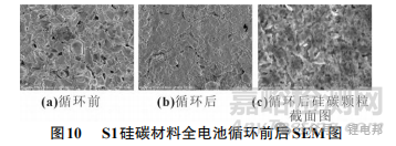 對(duì)循環(huán)前后極片的表面狀態(tài)進(jìn)行 SEM 考察,結(jié)果見圖 10。循環(huán)前,石墨和硅碳材料表面清晰[圖 10(a)];循環(huán)后,表面明顯產(chǎn)生一層包覆層[圖 10(b)],為厚的 SEI 膜。SEI 膜粗糙度高,消耗的活性鋰高,這對(duì)循環(huán)性能是不利的。因此,促使形成光滑的 SEI 膜(如進(jìn)行人工 SEI 膜構(gòu)筑、添加合適電解液添加劑等),可提升循環(huán)性能。對(duì)循環(huán)后的硅碳顆粒進(jìn)行截面 SEM 觀察[圖 10(c)],發(fā)現(xiàn)原來?xiàng)l形的硅納米顆粒變粗,并且多孔結(jié)構(gòu)基本消除,這主要是由于硅碳材料在循環(huán)過程中不斷發(fā)生體積膨脹和收縮的結(jié)果。因此,多孔結(jié)構(gòu)還需進(jìn)一步增強(qiáng),為硅基材料的體積膨脹提供足夠的緩沖空間。