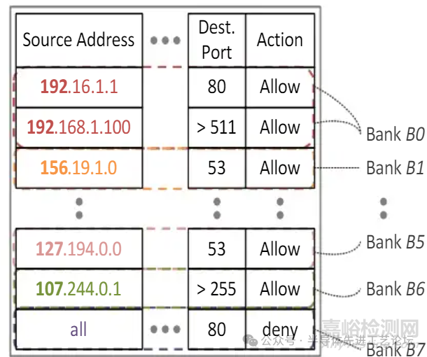 • 若數(shù)據(jù)包匹配了存儲(chǔ)塊 B6 中的規(guī)則,則不太可能同時(shí)匹配存儲(chǔ)塊 B0 中的規(guī)則。