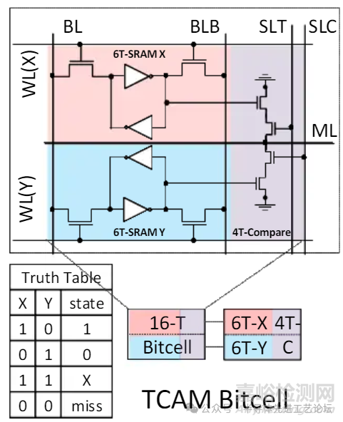 • 4T-NMOS堆疊結(jié)構(gòu): 將搜索關(guān)鍵字(Search Key)與TCAM中的三態(tài)值進(jìn)行比對(duì)