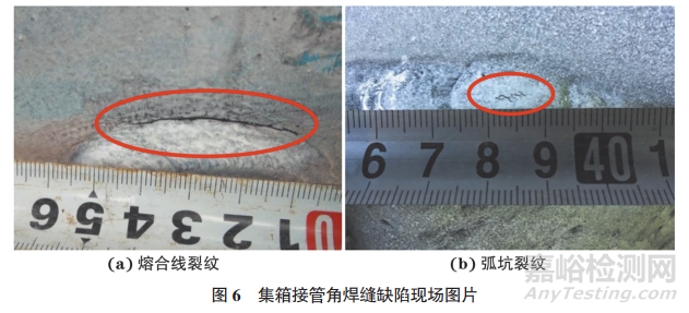 對(duì)集箱吊耳、接管座以及連接管管座角焊縫進(jìn)行磁粉檢測(cè),發(fā)現(xiàn)管座角焊縫處存在裂紋缺陷,該裂紋有兩種,即角焊縫與集箱母材熔合線裂紋和角焊縫弧坑裂紋(見圖6)。角焊縫處發(fā)現(xiàn)的熔合線裂紋以及弧坑裂紋均屬于表面裂紋,裂紋深度不深,對(duì)裂紋打磨消除后進(jìn)行圓滑過(guò)渡,若打磨深度較大,則應(yīng)對(duì)打磨部位進(jìn)行補(bǔ)焊處理,補(bǔ)焊后進(jìn)行熱處理。