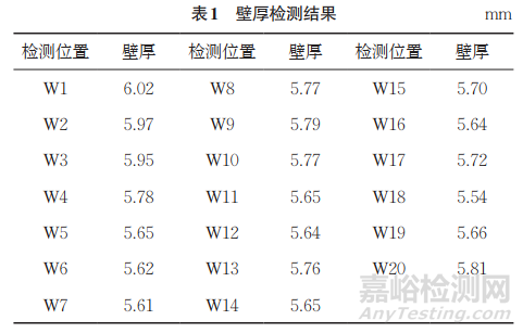 厚為3.68mm。由表1可知:實(shí)測(cè)厚度均大于設(shè)計(jì)壁厚和成品最小需要壁厚,滿足設(shè)計(jì)要求。