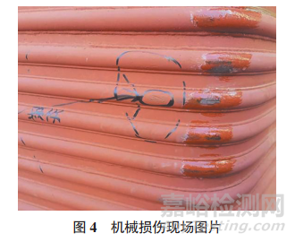 對(duì)某上部后墻水冷壁進(jìn)行目視檢測(cè),管屏材料為12Cr1MoVG鋼,規(guī)格為31.8mm×6.5mm。檢測(cè)發(fā)現(xiàn)第19根管子W2處存在機(jī)械損傷。檢測(cè)部位如圖3所示,機(jī)械損傷現(xiàn)場(chǎng)圖片如圖4所示。由于該機(jī)械損傷深度較淺,因此采用打磨消除+圓滑過(guò)渡的方法處理缺陷,并對(duì)打磨處的壁厚重新進(jìn)行測(cè)量,結(jié)果滿足設(shè)計(jì)要求。