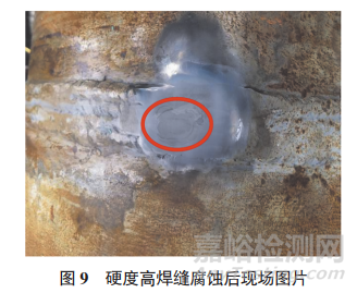 現(xiàn)場(chǎng)對(duì)焊縫硬度高的部位進(jìn)行研磨拋光,并用鹽酸三氯化鐵溶液腐蝕,可見明顯的熔合線痕跡 (見圖9),懷疑是安裝單位對(duì)焊縫進(jìn)行了補(bǔ)焊,補(bǔ)焊后未進(jìn)行回火熱處理導(dǎo)致的。焊縫中存在未回火的脆硬馬氏體,會(huì)使該處發(fā)生應(yīng)力集中。后期電廠運(yùn)行過(guò)程中,在機(jī)組啟停以及深度調(diào)峰產(chǎn)生的交變應(yīng)力作用下,極易在補(bǔ)焊區(qū)域的熔合線部位開裂。因此,在現(xiàn)場(chǎng)硬度測(cè)試時(shí),在焊縫、鋼管母材、彎頭/ 彎管等管件母材的每個(gè)圓周截面上,應(yīng)至少選擇3個(gè)部位(盡可能在圓周四等分的位置)進(jìn)行測(cè)試,防止材料硬度不均勻造成漏檢。