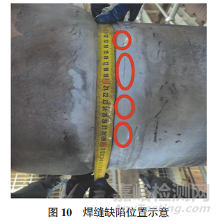 對(duì)低溫過(guò)熱器進(jìn)口連接管焊縫進(jìn)行磁粉檢測(cè),管道材料為12Cr1MoVG鋼,規(guī)格為426mm×55mm。檢測(cè)發(fā)現(xiàn)標(biāo)高53m爐右側(cè)低溫過(guò)熱器進(jìn)口連接管焊縫H正上方偏爐后沿熔合線200mm范圍內(nèi)存在斷續(xù)裂紋缺陷磁痕顯示,裂紋最長(zhǎng)為55mm。焊縫缺陷位置如圖10所示。對(duì)焊縫熔合線處裂紋進(jìn)行挖除,重新進(jìn)行補(bǔ)焊+回火熱處理,復(fù)檢合格。
