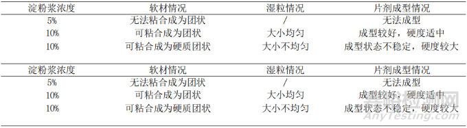 使用100℃的純化水中,按照5%、10%以及15%的濃度要求摻入淀粉,配制成為濃度不同的粘合劑,并分別取相同劑量進行軟材制作,對比其在軟材制粒效果及壓片成型性能方面的表現。
