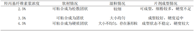 根據對比效果,使用3.5%羥丙基纖維素,所獲得的軟材粘合度更好,并且片劑成型之后的硬度適中,具體見表2。