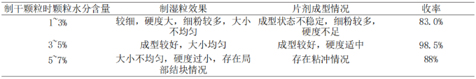 在實驗過程中,選用10%濃度的淀粉漿作為試驗粘合劑材料,分別制備含水量為1~3%、3~5%、5~7%共三種類型的干顆粒,通過對比不同含水量顆粒的制粒效果及其壓片后的成品收率,評估各條件對制粒及成型性能的影響。