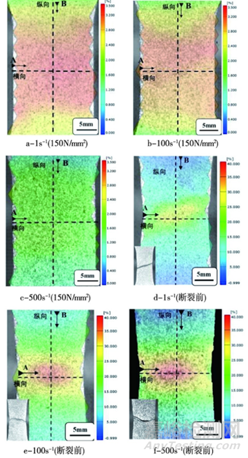 圖2所示為選取圖1a中A-F點(diǎn)應(yīng)力150N/mm2下和斷裂前的應(yīng)變云圖,并和斷裂試樣宏觀樣品照片對比。從圖可知,在應(yīng)力150N/mm2條件下,應(yīng)變值在標(biāo)距范圍內(nèi)近似均勻分布;隨應(yīng)變速率提高,應(yīng)變值下降;圖中試樣中央?yún)^(qū)出現(xiàn)了明顯的應(yīng)變集中區(qū);隨應(yīng)變速率的增加,應(yīng)變集中區(qū)影響面積變大。
