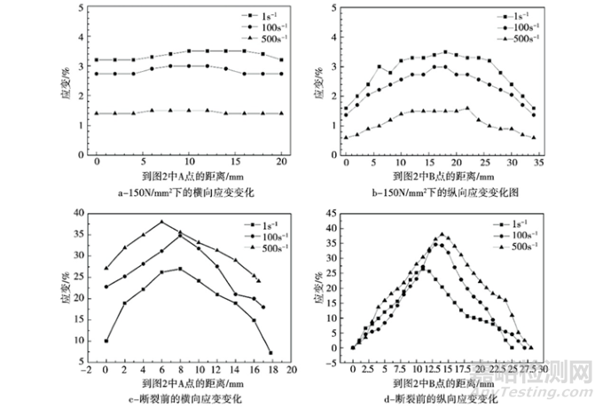圖3為材料的應(yīng)變變化曲線,可見,各個應(yīng)變速率下試樣的應(yīng)變值都隨著圖2中虛線A、B點(diǎn)的距離增大而先增大后減小,變形程度隨應(yīng)變速率增加而增大;如圖a,b,在大塑性變形條件下,橫向應(yīng)變大于縱向應(yīng)變;圖d可以看出縱向條件下的應(yīng)變變化更大,中部區(qū)域應(yīng)變集中度也更高,表明動態(tài)拉伸主要作用于縱向。