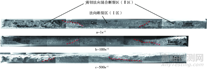 圖4為典型拉伸速率下斷口宏觀照片。結(jié)合圖2a~c斷裂前的應(yīng)力集中分布區(qū)和試樣斷裂宏觀照片可知,試樣斷口分為兩大區(qū)域,即由于應(yīng)力集中導(dǎo)致率先開裂的中部區(qū)域(Ⅰ區(qū))以及裂紋擴(kuò)展發(fā)生拉伸剪切混合開裂的兩端擴(kuò)展區(qū)(Ⅱ區(qū))。