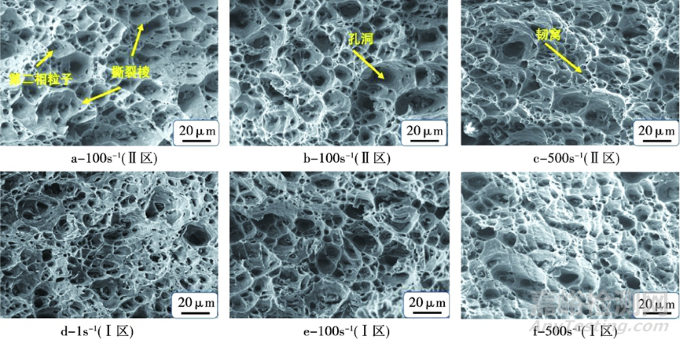 斷口形貌主要為大小不一的韌窩和撕裂棱組成;隨應(yīng)變速率增加,小型韌窩增多并長大,撕裂棱上逐漸出現(xiàn)韌窩乃至消失;與Ⅱ區(qū)相比,Ⅰ區(qū)斷口的撕裂棱明顯減少,隨應(yīng)變速率增加,韌窩增多,撕裂棱逐漸減少。