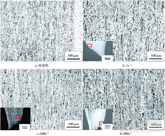 拉伸斷口側(cè)面的顯微組織。可以看出,拉伸前晶粒大小分布不均,拉伸條件下晶粒發(fā)生了明顯的伸長、變細(xì)。隨著應(yīng)變速率的提高,晶粒變形程度有進(jìn)一步變大的趨勢。