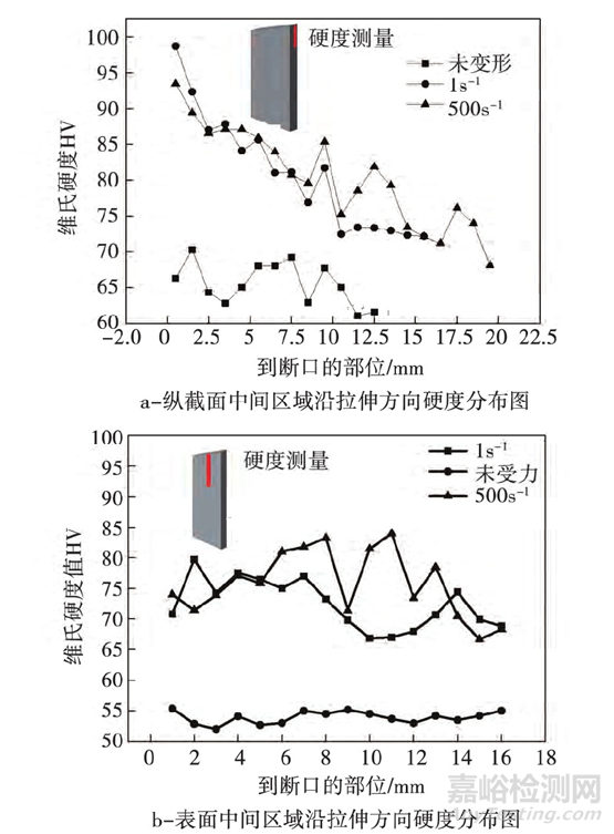 由圖7a可知,隨著離斷口距離的增加,維氏硬度值顯著下降。應(yīng)變速率為1s-1和500s-1試樣的硬度值相對于未變形試樣的顯著提高,加工硬化效果顯著。由圖7b可知,隨著應(yīng)變速率的提高,硬度值有一定程度提高。