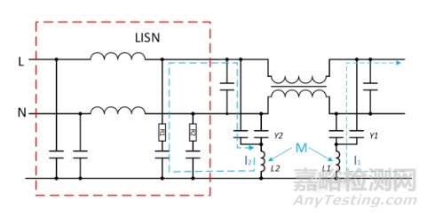 如圖,以EMI為例,如果存在EMI電流I1,由于Y電容的寄生電感的因素,考慮前后寄生電感的互感,就會(huì)產(chǎn)生騷擾電流I2,而I2是流過(guò)LISN的。