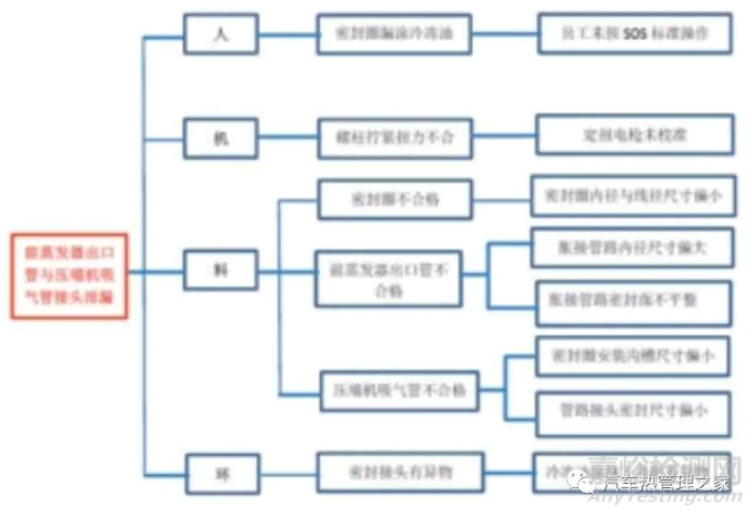 根據(jù)前蒸發(fā)器出口管與壓縮機(jī)吸氣管接頭密封原理分析,采用樹狀圖對(duì)該接頭泄漏問題從人、機(jī)、料、法、環(huán)等方面進(jìn)行全面分析(圖3)。