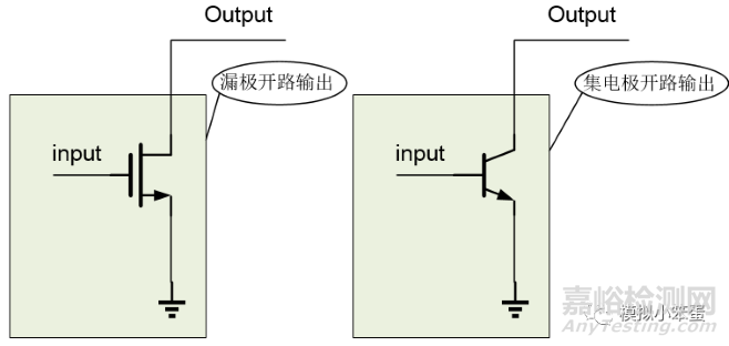 第二種是OC/OD輸出結(jié)構(gòu)。其為集電極開(kāi)路/漏極開(kāi)路輸出,電路如下圖所示。顯然這種結(jié)構(gòu)是沒(méi)法直接傳輸高電平的,系統(tǒng)應(yīng)用時(shí)必須要在開(kāi)路端增加上拉電阻。