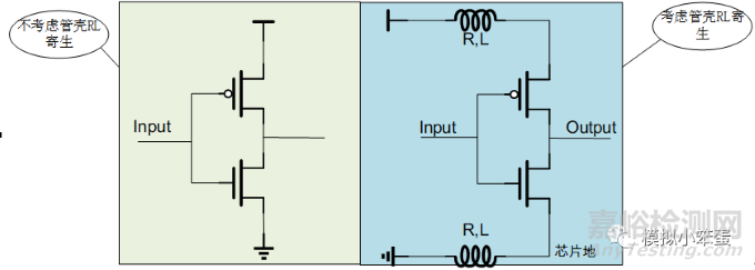 “地彈”是怎么形成的呢?地彈是由管殼寄生的L引起的。如下圖所示,我們先看左圖,不考慮管殼寄生L,芯片地認(rèn)為就是理想的地。再看右圖實(shí)際上芯片地和外部PCB地——認(rèn)為理想地之間存在寄生的L,當(dāng)反相器動(dòng)態(tài)工作時(shí),瞬態(tài)電流的變化會(huì)在L上產(chǎn)生感應(yīng)電動(dòng)勢(shì),所以就可以看到芯片地的彈動(dòng)是多么的歡快了。