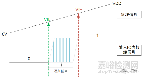 輸入IO第一次誤翻轉(zhuǎn)時(shí)對(duì)應(yīng)的輸入斜坡值為VIL,輸入IO最后一次誤翻轉(zhuǎn)時(shí)對(duì)應(yīng)的輸入斜坡值為VIH。需要注意的是斜坡信號(hào)必須足夠緩慢才能得到準(zhǔn)確的測(cè)量值,這里有一個(gè)經(jīng)驗(yàn)設(shè)定:斜率K=10mV/2T,T為翻轉(zhuǎn)周期,即兩個(gè)翻轉(zhuǎn)周期的時(shí)間斜坡變化量為10mV。斜率當(dāng)然越小越準(zhǔn)確,但相應(yīng)的仿真時(shí)間也會(huì)越長(zhǎng)。