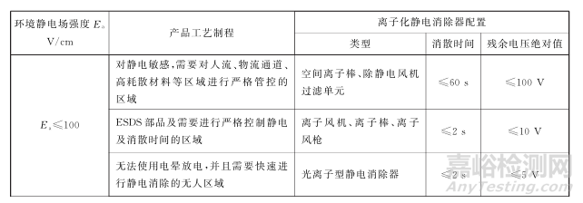 表 B.4 不同場景下離子化靜電消除器配置