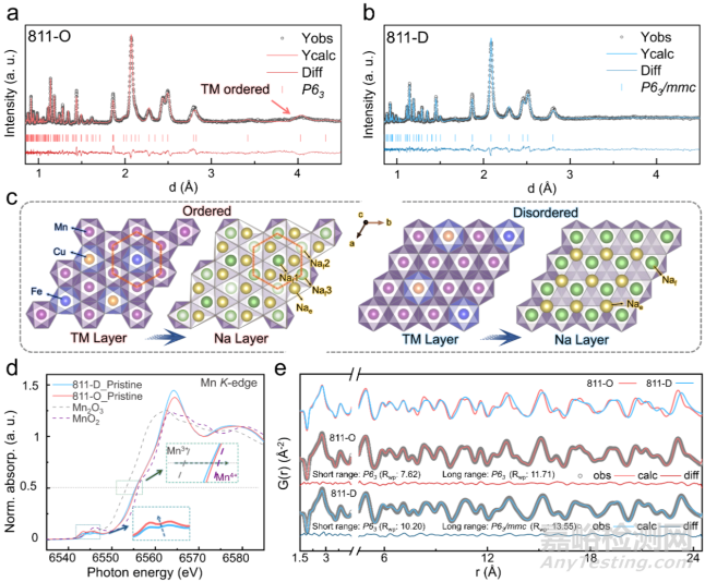 首先,通過調(diào)整固相合成反應(yīng)中的元素比例,成功合成了一系列P2型富錳層狀氧化物正極材料Na0.67Mn0.9-xFexCu0.1O2(其中x=0.1、0.2、0.3時(shí),依據(jù)過渡金屬層內(nèi)Mn、Fe、Cu元素的比例將其分別命名為811-O、721-O、631-O)。進(jìn)一步地,通過空冷方法合成上述樣品的改性樣品,分別命名為811-D、721-D、631-D。受限于常見的X射線和電子衍射結(jié)構(gòu)分析方法對近鄰過渡金屬元素有限的分辨能力,本研究采用對輕元素及近鄰元素敏感的NPD方法解析上述樣品的長程有序晶體結(jié)構(gòu)。如圖1a, b所示,常規(guī)固相合成的811-O在d≈4.03 Å處的特征峰表明其過渡金屬層中存在蜂窩狀超結(jié)構(gòu),而空冷樣品811-D則不存在該衍射峰。如圖1c左側(cè)橙紅色的六邊形框所示,有序樣品在過渡金屬層中形成TM@Mn6(TM=Fe或Cu)超結(jié)構(gòu)。TM@Mn6中的TM離子位點(diǎn)可分為三類:TM2a、TM2b1與TM2b2。TM2b1位點(diǎn)位于超結(jié)構(gòu)中心,這意味著Cu或Fe占據(jù)該位點(diǎn)的比例越高,過陽離子有序度越高。由于該有序結(jié)構(gòu)的存在,導(dǎo)致其晶體對稱性由P63/mmc降低至P63,這也使得鈉層的f位點(diǎn)由1個(gè)離散成3個(gè)(圖1c),勢必影響Na+的擴(kuò)散行為。此外值得注意的是,基于NPD的Rietveld精修結(jié)果表明,DoO(TM@Mn6)與氧空位濃度呈現(xiàn)顯著的負(fù)相關(guān)關(guān)系,而811-D中略微增加的Mn3+比例也進(jìn)一步印證了無序樣品具有較高的氧空位濃度(圖1d)。進(jìn)一步通過中子對分布函數(shù)(nPDF)對樣品的短程結(jié)構(gòu)進(jìn)行分析,如圖1e所示兩個(gè)樣品在1.5–4.5 Å的短程范圍內(nèi)均可用陽離子有序的P63空間群進(jìn)行良好擬合。然而,在4.5–24.5 Å的長程范圍內(nèi),811-D的陽離子有序被打破,其與NPD的結(jié)果一致。