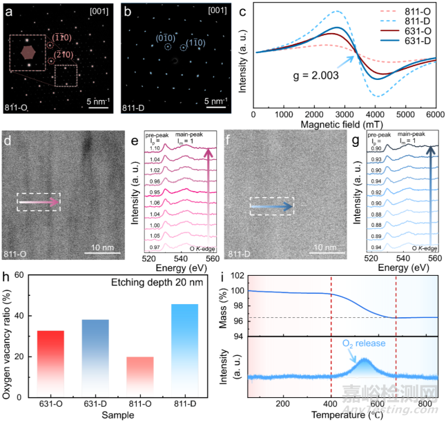 結(jié)合上文討論,進(jìn)一步聚焦于陰離子框架結(jié)構(gòu),試圖從中探究陽離子有序結(jié)構(gòu)的形成機(jī)制。本研究通過圖2c-e所示的EPR、EELS、XPS等表征技術(shù),明確了陽離子無序樣品存在更多的體相氧空位。結(jié)合TGA測試、原位變溫中子衍射和TGA-MS聯(lián)用測試(圖2i),進(jìn)一步證實(shí)了陽離子無序形成于氧釋放之后,即氧空位驅(qū)使過渡金屬層內(nèi)無序。這是因?yàn)檠蹩瘴坏男纬纱偈共糠諱n4+還原成Mn3+以補(bǔ)償電荷,從而降低了其與Fe3+和Cu2+的離子半徑差異,有利于過渡金屬層內(nèi)的無序排布。