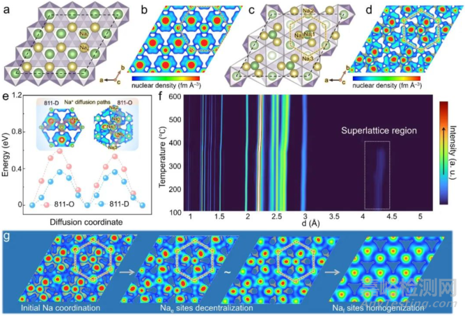 鑒于二者的電化學(xué)行為差異,將進(jìn)一步探究陽離子無序化對Na+擴(kuò)散行為的影響機(jī)制。基于中子衍射的最大熵方法(MEM)能夠通過最大化信息熵重建核密度分布,從而實(shí)現(xiàn)對晶格內(nèi)的核散射密度分布的最佳估計(jì)。在精確分析材料晶體結(jié)構(gòu)的基礎(chǔ)上,對層狀材料鈉層內(nèi)正散射密度的重構(gòu)有助于預(yù)測可能的Na+遷移路徑,進(jìn)而也可揭示Na+遷移路徑的演變過程。如圖4a, b所示,陽離子無序樣品表現(xiàn)出較為均勻的Na+分布,Nae和Naf位點(diǎn)之間具有良好的連通性。而圖4c, d所示的陽離子有序樣品則表現(xiàn)出Nae位點(diǎn)上的Na+聚焦于Naf1周邊,降低了其與Naf2(3)之間的連通性。通過對MEM模擬得到的不同Na+遷移路徑進(jìn)行能壘計(jì)算,證實(shí)了陽離子無序樣品具有更低的遷移能壘(圖4e)。此外,由圖4f中所示811-O的原位變溫中子衍射實(shí)驗(yàn)結(jié)果,可知在400 ℃時(shí)其陽離子有序峰消失,結(jié)合MEM可揭露陽離子無序化過程中的Na+遷移路徑的演化機(jī)制。如圖4g所示,Nae位點(diǎn)上Na+的離散化提升了其與Naf2(3)位點(diǎn)之間的連通性,在升溫末期實(shí)現(xiàn)了Naf位點(diǎn)的同質(zhì)化,即與811-D具有相同的鈉位點(diǎn)分布。