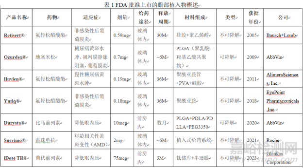 預(yù)成型眼部植入物旨在實現(xiàn)長效釋放,減少給藥頻率,提高給藥便利性。近年來,用于蛋白質(zhì)/肽和皮質(zhì)類固醇持續(xù)釋放的植入物已得到廣泛研究。FDA批準的緩釋植入物總結(jié)見下表1,本節(jié)重點介紹兩類用于眼部的預(yù)成型植入物:可降解型與不可降解型。