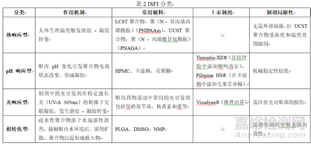在治療濕性年齡相關(guān)性黃斑變性(AMD)等后眼部疾病時,需考慮藥物完全釋放后不可降解植入劑的取出問題,此時原位形成植入劑(ISFI)因其侵入性較低,顯示出一定的治療優(yōu)勢。ISFI 通常根據(jù)觸發(fā)其液-固轉(zhuǎn)變的機制分類,包括溫度敏感型(熱響應(yīng))、pH 響應(yīng)、光響應(yīng)或溶劑交換型(相轉(zhuǎn)化)。PLGA 微粒負載舒尼替尼的 ISFI 進入 II 期臨床試驗(NCT03953079),該制劑為每 6 個月玻璃體內(nèi)給藥注射一次。ISFI的主要機制及分類見表2。