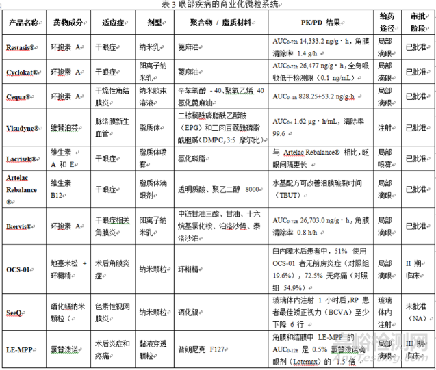 微粒系統(tǒng)包括納米粒、脂質(zhì)體、樹枝狀大分子和固體脂質(zhì)載體等,這些系統(tǒng)在眼部疾病治療中具有獨特優(yōu)勢,因為其能夠增強藥物溶解度、跨越眼部屏障、延長藥物滯留時間并降低全身毒性。但該類遞送系統(tǒng)臨床轉(zhuǎn)化仍然比較有限,研發(fā)工作應(yīng)集中在優(yōu)化顆粒尺寸、表面化學(xué)性質(zhì)和生物相容性,以實現(xiàn)安全有效的眼內(nèi)給藥,表3總結(jié)了用于治療眼部疾病的商業(yè)化微粒系統(tǒng)