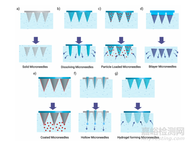 微針(Microneedles, MNs)是一種先進的微米級針狀陣列,長度范圍為50μm至2mm,外徑≤300μm,自微針問世以來,其應(yīng)用領(lǐng)域已擴展至多種給藥場景,包括眼組織(前段和后段)、血管組織、胃腸道、口腔、泌尿生殖系統(tǒng)和心肌的治療性細胞遞送。微針技術(shù)使單克隆抗體(mAbs)能夠進入眼部難以到達的區(qū)域,從而治療新生血管性疾病。微針類型(見圖3)包括固體微針、可溶解微針、顆粒負載微針、雙層微針、涂層微針、中空微針和水凝膠微針。