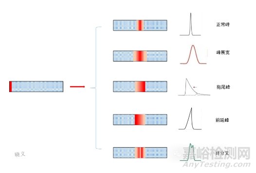 圖示異常峰原因分析可以看出,色譜柱中樣品的濃度分布、譜帶的擴(kuò)散,直觀表現(xiàn)為色譜峰峰型。色譜譜帶的過度擴(kuò)散,可導(dǎo)致色譜峰展寬;樣品濃度非正態(tài)分布,分別導(dǎo)致前延峰、拖尾峰或分叉峰等異常峰。