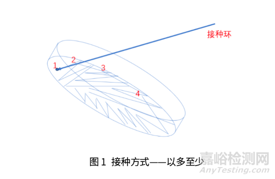 (4)活化、接種:菌種的來(lái)源可以是涂布的平板也可以是保存在-80℃的菌種。關(guān)閉紫外線(xiàn),打開(kāi)超凈工作臺(tái)通風(fēng),點(diǎn)燃酒精燈,將接種環(huán)放置在酒精燈上灼燒至紅色,放置在火焰周?chē)鋮s。挑取適量菌落或者菌液進(jìn)行劃線(xiàn),使得菌液以多至少的量(圖1)分布在培養(yǎng)基表面。