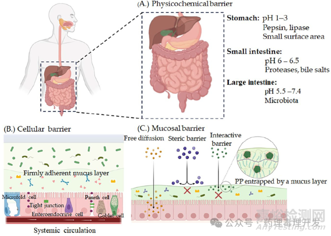 PP治療藥物通常被歸類為生物藥劑學(xué)分類系統(tǒng)(BCS)的Ⅲ類(低滲透性、高溶解度)或Ⅳ類(低滲透性、低溶解度),口服生物利用度通常低于1%,有時(shí)甚至低于0.1%。PP通過胃腸道吸收的主要障礙包括化學(xué)因素、酶解因素以及與胃黏膜和腸上皮層相關(guān)的滲透因素。