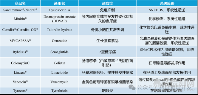 由于PP藥物口服給藥面臨巨大挑戰(zhàn),只有少數(shù)開發(fā)成功。部分產(chǎn)品羅列如下。