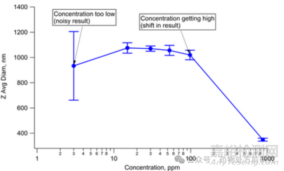當(dāng)使用動(dòng)態(tài)光散射(dynamic light scattering,DLS)測(cè)定納米顆粒尺寸時(shí),一個(gè)重要的參數(shù)是顆粒濃度。如果顆粒濃度過低,顆粒的散射信號(hào)較弱,這會(huì)導(dǎo)致測(cè)量結(jié)果噪聲較大。如果顆粒濃度過高,由于顆粒間的相互作用,測(cè)量結(jié)果會(huì)發(fā)生畸變。這些相互作用可能是在高顆粒濃度下發(fā)生的顆粒-顆粒碰撞(particle-particle interactions),或者是長(zhǎng)程的靜電相互作用(long range electrostatic interactions)。無論是哪種情況,這些相互作用都會(huì)改變顆粒的運(yùn)動(dòng)軌跡,與計(jì)算DLS數(shù)據(jù)中顆粒尺寸時(shí)假設(shè)的運(yùn)動(dòng)狀態(tài)不同。在高顆粒濃度下,數(shù)據(jù)看似正常,但尺寸結(jié)果會(huì)發(fā)生畸變。因此,在開發(fā)測(cè)量方法時(shí),必須始終考慮顆粒濃度。