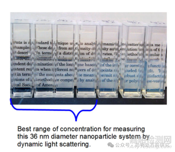 選擇顆粒濃度有兩種方法。第一種是檢查懸浮液,選擇從清澈到略微渾濁的懸浮液。這種方法被稱為“目測(cè)法”。第二種方法是測(cè)量一系列懸浮液的尺寸,并繪制測(cè)量尺寸隨顆粒濃度的變化曲線。然后選擇測(cè)量尺寸不隨濃度變化的濃度范圍。需要注意的是,在此類研究中,濃度是按指數(shù)變化而非線性變化的。也就是說,濃度序列應(yīng)為2、4、8、16……的形式,而不是2、4、6、8……。在處理未知的納米顆粒系統(tǒng)進(jìn)行動(dòng)態(tài)光散射尺寸測(cè)量時(shí),通常首先采用目測(cè)法。一旦確定了大致濃度范圍,濃度研究就會(huì)變得顯著更簡(jiǎn)單和快速。