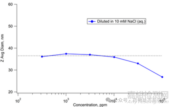 對(duì)于真正納米尺度(36納米)的樣品,下圖展示了測(cè)量尺寸隨濃度的變化曲線。在高濃度下,尺寸結(jié)果同樣發(fā)生畸變。需要注意的是,對(duì)于這種納米顆粒,測(cè)量的濃度范圍遠(yuǎn)高于第一個(gè)例子中1微米顆粒的濃度范圍。實(shí)際上,最佳濃度范圍取決于顆粒的尺寸分布和散射能力。