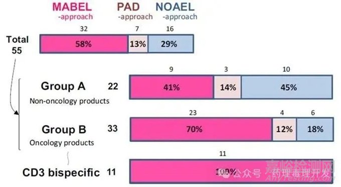 文中分析了2001年至2022年公開可用的356種免疫調(diào)節(jié)劑的數(shù)據(jù)。如下圖所示,免疫調(diào)節(jié)劑被分為兩組:A組是非腫瘤適應(yīng)癥(如過敏或自身免疫疾?。?,主要是免疫抑制劑,急性毒性風(fēng)險(xiǎn)較低;B組是用于腫瘤適應(yīng)癥的藥物,主要是免疫刺激劑,急性毒性風(fēng)險(xiǎn)較高。MABEL方法成為腫瘤相關(guān)免疫調(diào)節(jié)劑(B組)FIH劑量設(shè)定的首選方法,達(dá)70%。尤其是CD3雙特異性抗體,100%采用MABEL法。