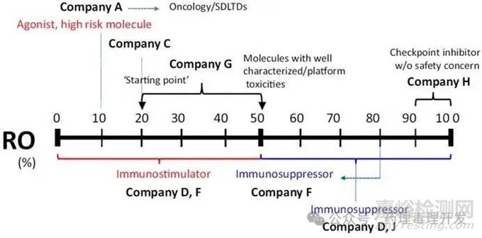 MABEL法中最常用的兩個(gè)指標(biāo)是RO值(%)和細(xì)胞實(shí)驗(yàn)的ECx(有效濃度)。那么企業(yè)究竟如何選擇這些量值呢。先看下RO值(%),如下圖所示。總體趨勢(shì)是對(duì)于高風(fēng)險(xiǎn)免疫調(diào)節(jié)劑使用小于50%的RO值,而對(duì)于低風(fēng)險(xiǎn)產(chǎn)品則使用大于50%的RO值。然而,在選擇具體數(shù)值時(shí)存在一些差異。例如,對(duì)于免疫激活劑,公司A選擇了10%的RO作為起始點(diǎn),公司C選擇了20%,公司G則在20%-50%之間。公司D和F采用了小于50%的RO范圍。對(duì)于免疫抑制劑,基本選擇了大于50%的RO。
