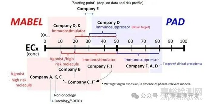 對(duì)于ECx選擇方面,對(duì)于免疫激動(dòng)劑,4家公司(A、B、C、J和K)傾向于選擇EC10作為起始點(diǎn)。一些公司(D、F、J和K)還展示了不同的取值區(qū)間,例如EC20-EC30或EC20-EC50。對(duì)于免疫抑制劑,如果是新靶點(diǎn)藥物,公司D選擇EC30-EC50。對(duì)于已經(jīng)有臨床先例的靶點(diǎn),公司A、D、F選擇EC50-EC80進(jìn)行計(jì)算。